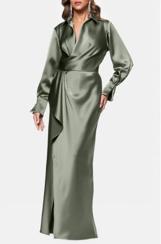 A long-sleeve satin gown is a timeless wardrobe piece for formal events and special occasions. The smooth satin fabric drapes beautifully, creating an elegant and graceful look that feels luxurious without being overdone.